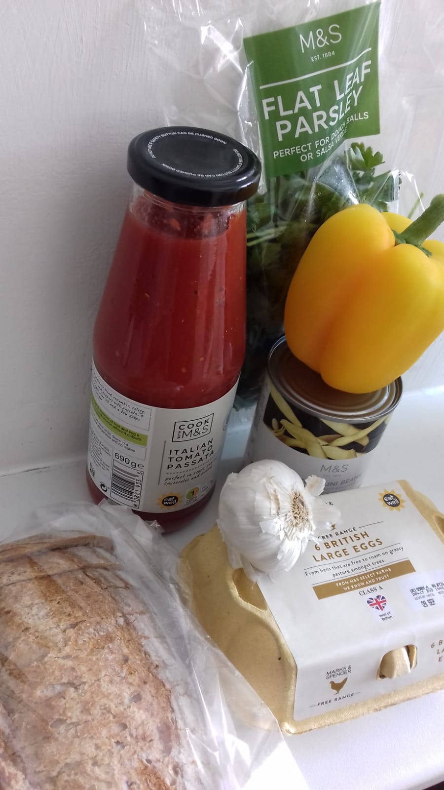 No zing necessary here though as you have the juicy tomato base, the crunchy piquancy of the yellow peppers and the herbal interest of the parsley. The russet beauty of the base is intensified by the glorious yellow yolks nestled like the sun in a red sky at night. The eggs and the cannellini beans give a creamy texture and give it the feel of a stew – with extra! This would certainly sustain you on the fields of Campania.