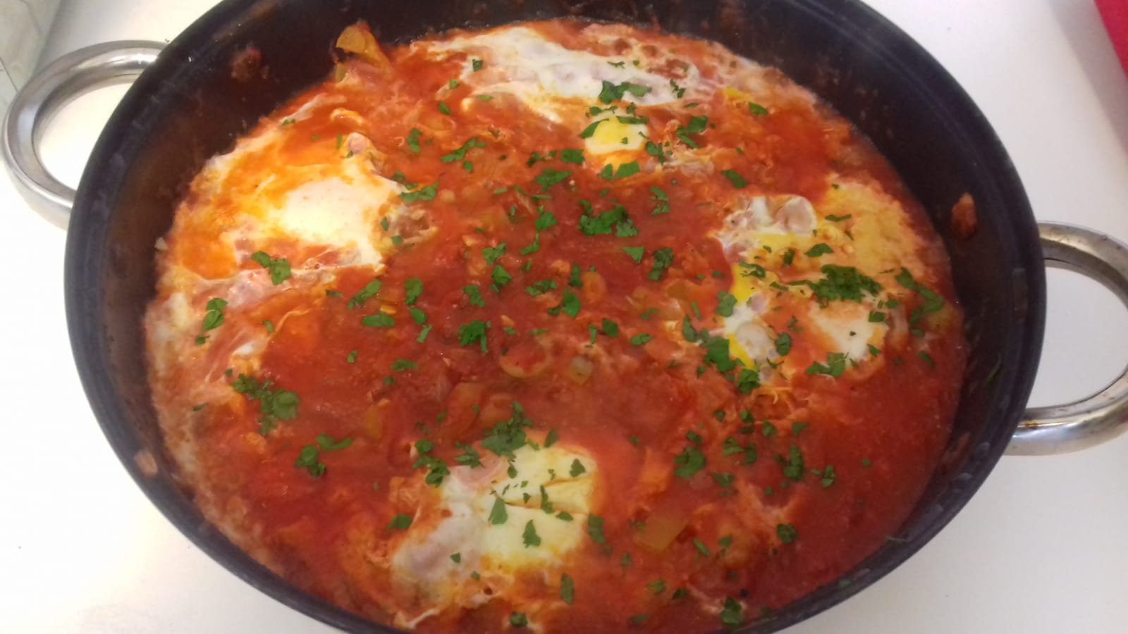 - Turn off the heat and let it rest for a few seconds, then carefully use a serving spoon and put the eggs into bowls and add the tomato sauce. Serve them while they are hot with some freshly sliced sourdough bread. Garnish with chopped parsley.