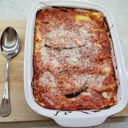 - Cover with foil and bake on the top shelf of the oven for about 20 minutes. Remove the foil and return to the oven for 5 minutes. You can check if the pasta is cooked by putting a sharp knife into it. Allow the lasagna to stand for 5-10 minutes before serving. Cut into squares and serve with a drizzle of extra virgin olive oil if required. Recipe Notes: You can use ready peeled tomatoes instead of fresh ones. I made this dish without precooking the pasta sheets. You can store Norma lasagne in the refrigerator, covered with plastic wrap or in an airtight container for 1-2 days.
