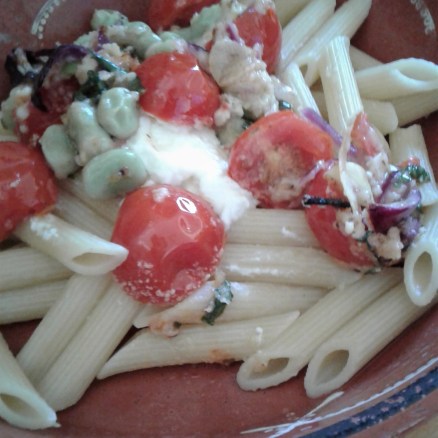 - Put the onion, broad beans, garlic, some chopped basil leaves, oregano and tomatoes into a large bowl add salt and pepper to taste. Drizzle 2 tbsp of olive oil into the bowl and mix with a spoon to coat the sauce ingredients. Transfer to a deep oven dish (tomatoes cut side up) and sprinkle the tomatoes with breadcrumbs and grated pecorino.