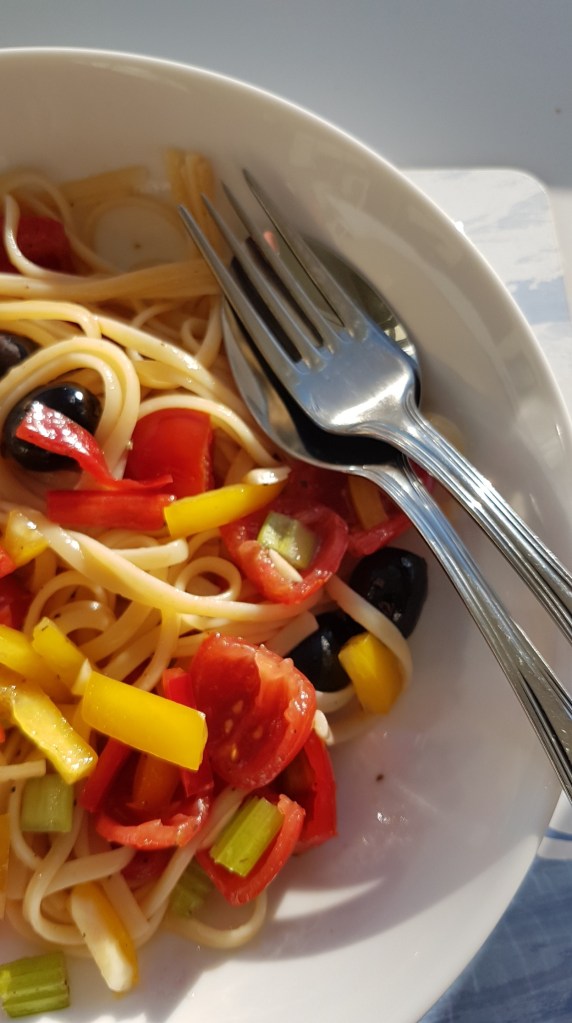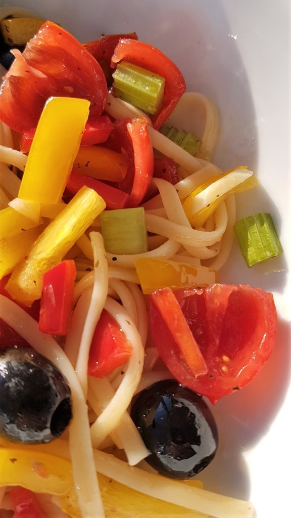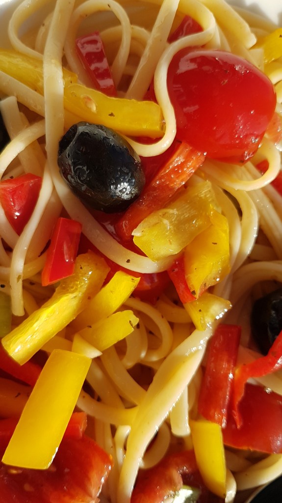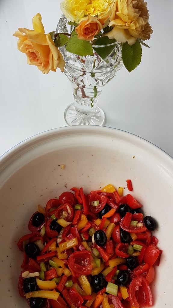 - 3 small sweet peppers, red and yellow and orange, finely sliced 2 to 3 cm long –20 Italian mixed pitted olives e.g. Norcellara, leccino