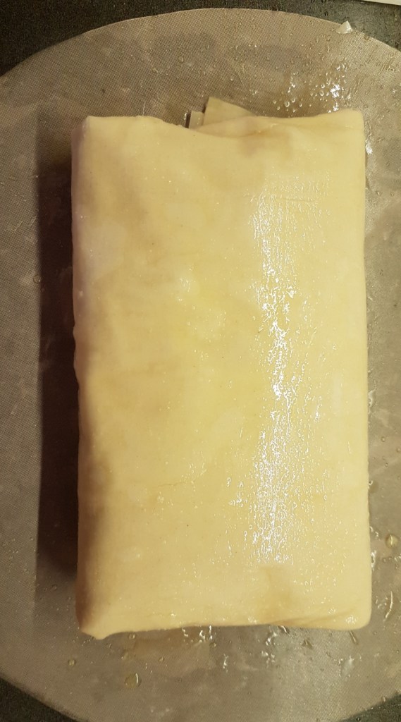 - Brush a suitably sized baking tray with a little of the melted butter. Spread out one sheet of filo on the baking tray, and brush with some more of the butter. Repeat the process with all four sheets, placing them on top of each other, brushing with melted butter each time. Spoon the apple mixture along the middle of the pastry and roll up — from the bottom first, then the sides, ending with the top — to make into a parcel. Carefully turn the parcel over so the seam faces downwards.